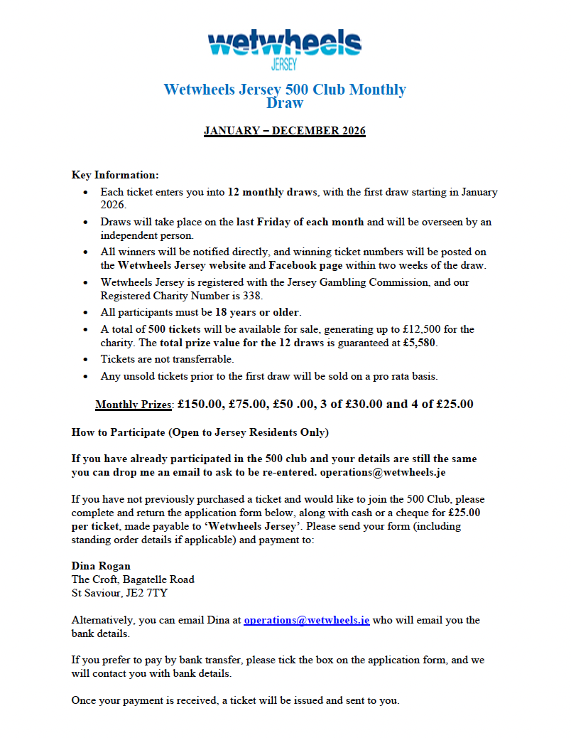 If you have not previously purchased a ticket and would like to join the 500 Club, please complete and return the application form below, along with cash or a cheque for £25.00 per ticket, made payable to ‘Wetwheels Jersey’. Please send your form (including standing order details if applicable) and payment to:
